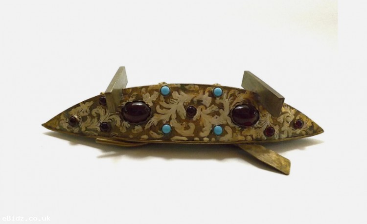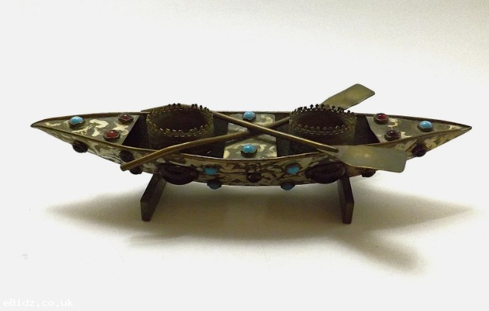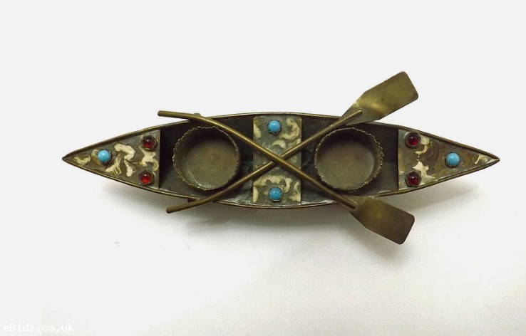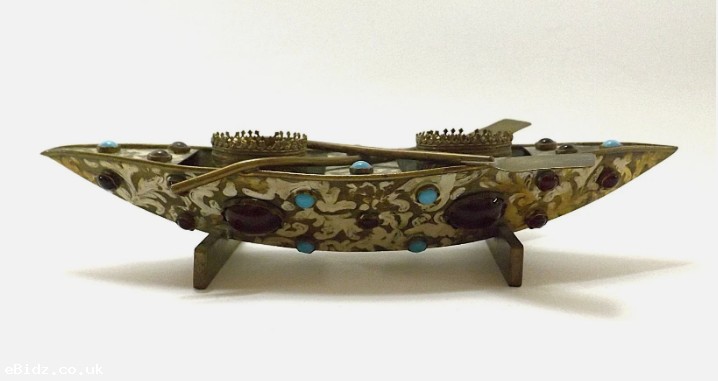 ANTIQUE BRASS METAL JEWELLED INKWELL STAND IN BOAT FORM